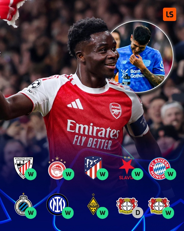 10战9胜!阿森纳成为本赛季欧冠赛场唯一一支仍未输球的球队