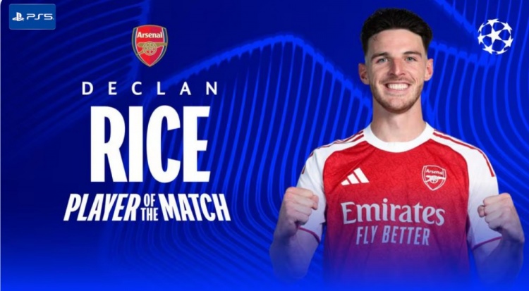 攻防俱佳!赖斯当选阿森纳vs勒沃库森全场最佳球员